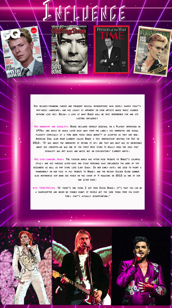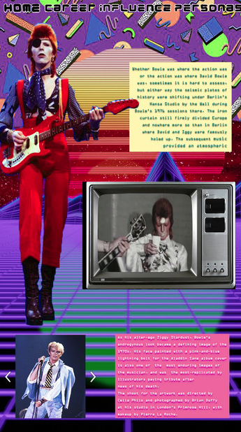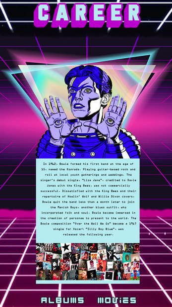 As part of a class assignment, I developed a website that embodies an iconic artist. After careful consideration, I chose David Bowie as the subject of my project, owing to his dynamic and colorful personality. Bowie’s rise to fame in the 1980s was marked by his fearless embrace of his individuality, setting an example that continues to inspire people today. Through the website’s design, colors, layout, and photography, I aimed to pay tribute to Bowie’s profound impact on countless individuals worldwide.